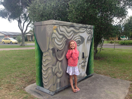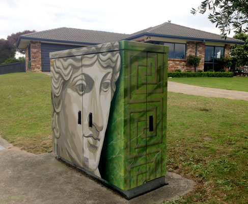 This cabinet is located in the Olive tree lined 'Greek Quarter' of Papamoa. On the Corner of Athena and Olympus Grove.